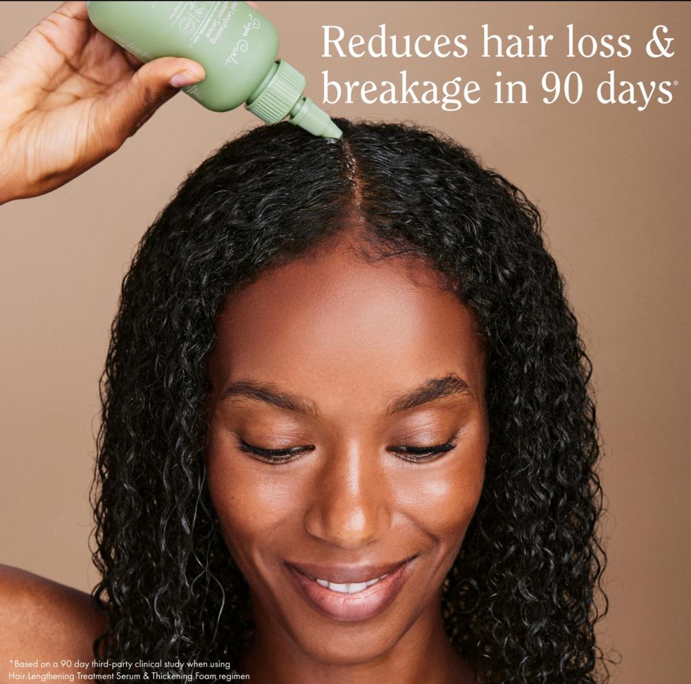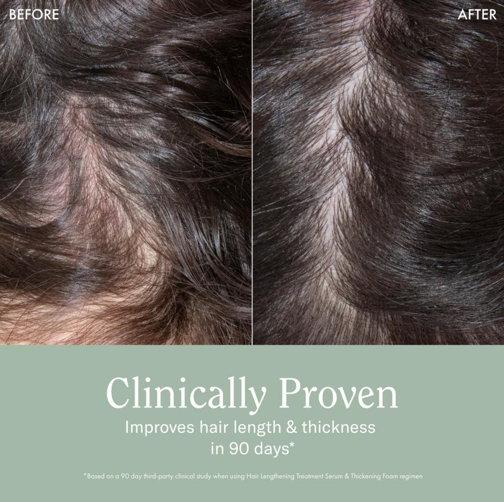 *Based on a 90 day third-party clinical study when using Hair Lengthening Treatment Serum and Thickening Foam regimen